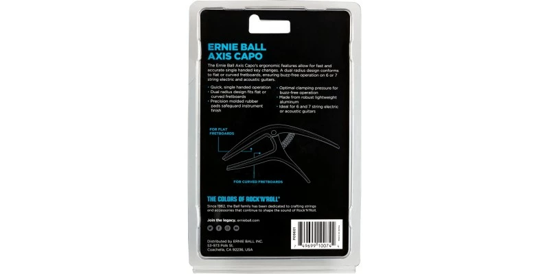 The Ernie Ball Axis Capo’s ergonomic features allow for fast and accurate single-handed key changes. A dual-radius design conforms to flat or curved fretboards, ensuring buzz-free operation on 6 or 7 string electric and acoustic guitars.